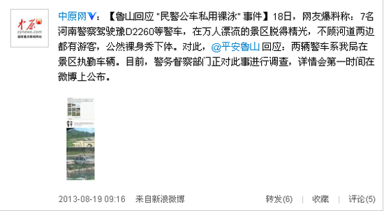 平顶山市鲁山县公安局官方微博“平安鲁山”对警察在景区内下河洗澡一事作出回应,称警车确系执勤车辆,将展开调查。声明如下: