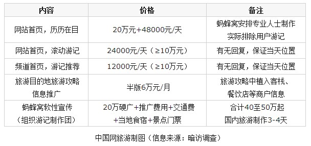 此外,上述工作人员同时表示,蚂蜂窝上发布的各旅游目的地攻略也都可以付费植入,商户信息植入的价格是半版6万元/月。