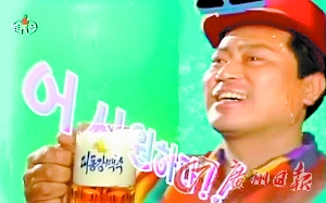 大同江啤酒广告中,一名朝鲜男子手举一杯啤酒,画面出现一行句子,内容为“啊,真凉爽!”