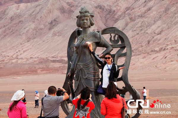 新疆维吾尔自治区吐鲁番地区,游客在吐鲁番火焰山景区铁扇公主雕像旁拍照留影。
