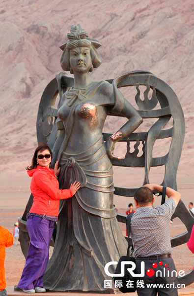 2013年08月21日,新疆吐鲁番火焰山景区铁扇公主雕像优雅大方,是景区一道亮丽的风景线,游客多次与铜像“亲密接触”。2012年10月雕塑修补还不到一年时间,铁扇公主铜像胸部“裸露”已呈红色。火焰山景区曾立牌禁止游客攀爬触摸雕像,但作用不大,游客的不文明行为与火焰山风景区壮美的自然景观形成强烈反差。