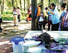 昨日下午,北京青年报记者前往位于大兴区榆垡镇的北京野生动物园。在园区内,北青报记者共发现两处与动物合影摊位,分别位于园区内珍稀鸟馆和孔雀园附近。