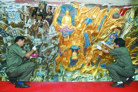 重新穿上"金衣"的造像与旁边灰白、斑驳的造像形成了鲜明对比。 记者 邹飞 摄