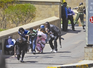 9月21日,在肯尼亚内罗毕,人们在警察的掩护下撤离韦斯特盖特购物中心。 新华社 /法新