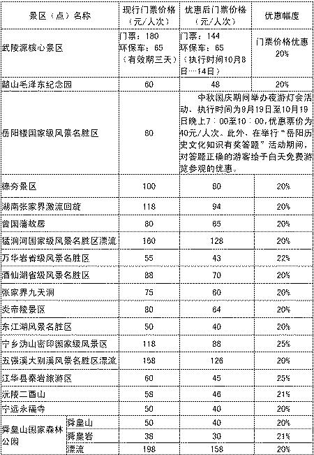 湖南列入此次“十一”优惠范围的18个景区中,有张家界(武陵源)核心景区、韶山毛泽东纪念园、岳阳楼3个5A级景区;曾国藩故居、炎帝陵景区、东江湖风景名胜区等9个4A级景区及国家级重点风景名胜区德夯景区等。18个景区优惠幅度在20%至50%不等。此外,在举行“岳阳历史文化知识有奖答题”活动期间,对答题正确的游客还将给予岳阳楼国家级风景名胜区白天免费游览参观的优惠,免费额度达80元。(具体优惠详见右表)