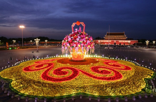 天安门广场国庆中心花坛“祝福祖国”,将于今日全部布置完毕,花坛上的主景观“花果篮”,昨日已经吊装到主花坛的位置,在进行最后的补漆。