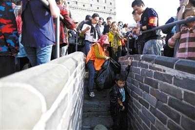 10月6日,黄金周第六天,北京八达岭长城景区累计游客人数达35.66万人,产生垃圾共计109吨。