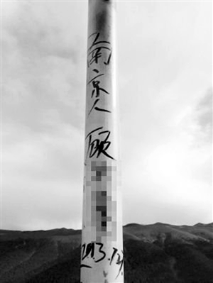 10月5日傍晚6点45分,一位网友发微博称,“终于见识到南迦巴瓦峰的羞涩与壮丽,但这位南京人却十分煞风景!”两张微博图片中,一张是蓝天白云下的绵延山峰,非常壮美。另一张,则是一根白色的圆柱,背景同样是群山。圆柱上,非常刺眼地写着“南京人顾某某”的字样,落款日期似乎为2013年7月27日。