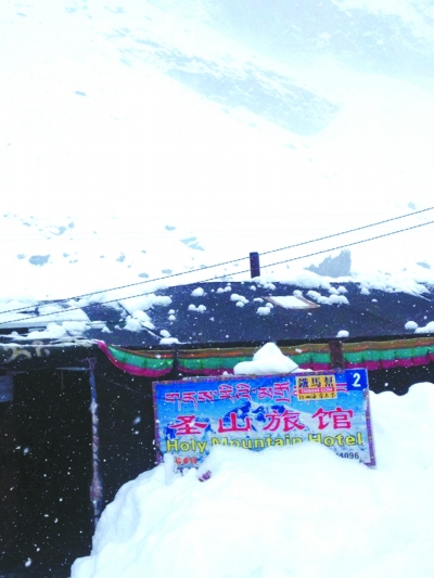 积雪很厚,部分遮住大本营帐篷旅馆招牌
