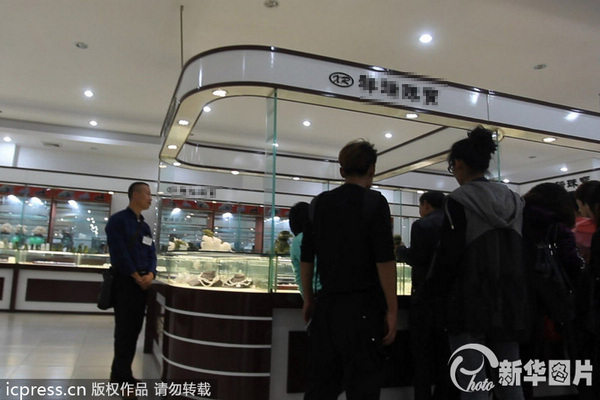 进入珠宝店,业务员先用约5分钟的时间,给游客讲解玉器、貔貅的好处后,推开一扇门,门内数百平米的展示柜台前,近百名销售员早已“严阵以待”。“在这逛半小时后,集合会有人带你们去吃饭。”同时,一业务员透露,来这里的都是导游带过来的旅行团,“生意还不错,在这里待半个小时,我们还免费提供一顿饭。”然而,晚餐10人一桌,只有勉强盛满盘底的7份便宜素菜。