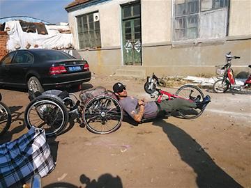 和Tom一起的还有一名美国友人,他的中文名字叫 “小谭”,在北京工作已有十年的时间,能说一口流利的中文。 “此次我们的目标是中国的大好河山,基本路线是北京-山东-贵州。”小谭是个健全人,在旅行途中骑山地车,而双腿残疾的Tom则驾驶一种特制的自行车。