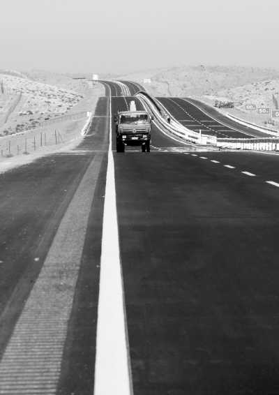 10月20日,由中铁二十局集团承建的新疆首条沙漠高速公路——G216线五彩湾至大黄山(五大)高速公路全线完工。五大高速公路是新疆首条沙漠高速公路,穿越新疆北部古尔班通古特沙漠,全长约96.6公里,合同投资近16亿元,2011年4月12日开工,目前正处于交工验收阶段,预计不久即可全线通车。图为一辆施工车在高速公路上行驶。