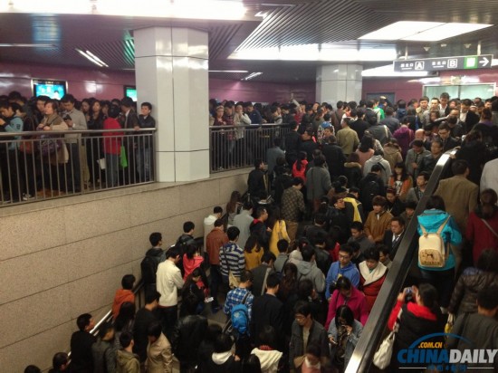 10月24日晨,北京地铁10号线再现故障,部分列车晚点,部分站点限流,导致旅客滞留。图为北京地铁十号线惠新西街南口站换乘乘客。 中国日报记者 杜涟猗 摄 图片来源:中国日报网