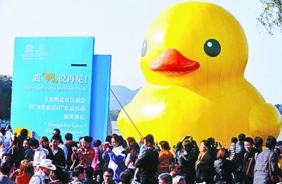 “3天后,专属于北京的这只‘大黄鸭’将被彻底放气。”昨天下午,“鸭爸”霍夫曼携手成龙、林依轮等明星,在颐和园八方亭出席主题为“跟‘鸭’说再见”的欢送活动。包括使馆代表、设计师、鸭迷等近万人手举黄鸭,向漂浮在昆明湖的“大黄鸭”说再见。记者发现,有网友随后调侃活动主题“很有北京特色”,但也有市民质疑“谐音不雅”。