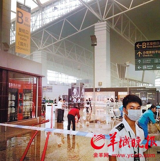 大火过后,候机厅水流满地 羊城晚报 记者 汤铭明 摄