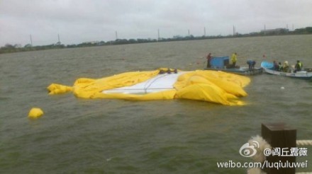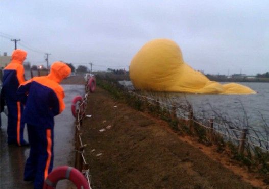 周四晚间,桃园新屋乡后湖村停电,小黄鸭打气机无法充气,屋漏偏逢连夜雨,备用发电机不明原因停摆,造成小黄鸭漏气。周五一大早工作人员到场,看到小鸭的狼狈样,急忙充气善后。但已有游客到场,拍摄到照片了。