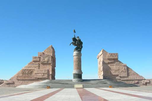 恢宏大气的气壮山河门景,一座成吉思汗手持苏勒德的跃马雕像,高21米。这是指成吉思汗从1206年建立大蒙古国到1227年去世的年限。这座跃马雕像像是一座丰碑,记载着一个震撼世界的伟人。