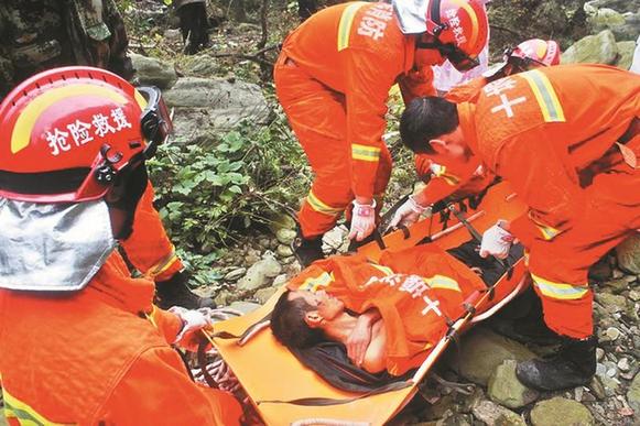 当日12时10分,救援官兵到达事发山地。据55岁的报警者江需东介绍,当日9时左右,他刚到大沟村与大坪村交界处的铁扫把沟山,正准备采摘野核桃时,隐约听见从不远处传来救命声,他循声找去,在一条小溪旁看到一名男子半躺水中,全身伤痕累累,极度虚弱。他急忙将该男子拖到干燥平坦处安置好。