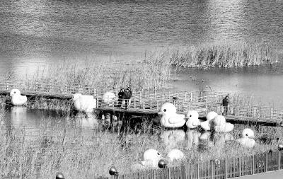 记者昨日在园博园里发现,园博湖和锦绣谷里多了一些憨态可掬的“山寨小黄鸭”,引来不少游客的驻足观赏。