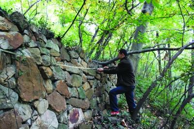 昨天上午,扬子晚报记者跟随景区工作人员来到现场,只见一排长长的石头位于景区“万松山房”的南面,已进入“乾隆行宫”的范围。“当时这组石头整体基本隐藏在草丛中。”工作人员介绍说,宽约50厘米,高低不等,不注意根本看不到它。走近一看,它由很多的岩石叠砌而成,其材料是本地的砂岩。不过,砂岩中的颗粒有粗细之分,墙体叠砌时利用小石块支垫,下部石块较上部的石块稍大,表面附有青苔,建筑风格以及使用的建筑材料,基本上和附近的为保卫乾隆皇帝的御林军的驻扎地——小营盘的围墙一模一样。