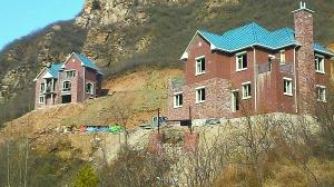 工人告诉记者,他们是今年6月份开始在这里施工的。工人们先用挖掘机挖树碎石,从山麓起向上开出一条坡道,在大约20米高的地方再进一步开挖山体、填平沟坑、平整土地,然后就山势建房,每个山坡他们要耗费近一周的时间才能挖出路来。记者看到,每幢别墅下的山丘坡面上,尽是些碎石块和小石子儿,很多石块摇摇欲坠,别墅后面也是裸露的岩石和黄土坡,与四周植被葱郁的山坡十分不相称,犹如一块块斑秃。虎峪山谷中原本保持较好的自然植被以及山石,多处遭到了人为破坏。