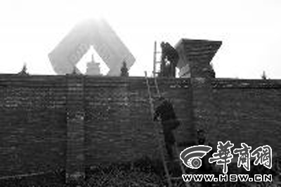 21日中午,记者刚将车停到法门寺景区停车场,就有一名中年妇女过来,说90元便能游览景区。记者问有没有票?她说有票,并拿出了两张写有“免票”字样的门票,后面标有“法门寺文化景区接待用票”。随其上了一辆面包车向景区北边驶去。十来分钟后,到了位于合十舍利塔北侧的墙外,一名早已在墙边等候的男子,将一架梯子架起,迅速爬上墙头后,从同伴手中接过另一架梯子放好后,便催促大家尽快通过。