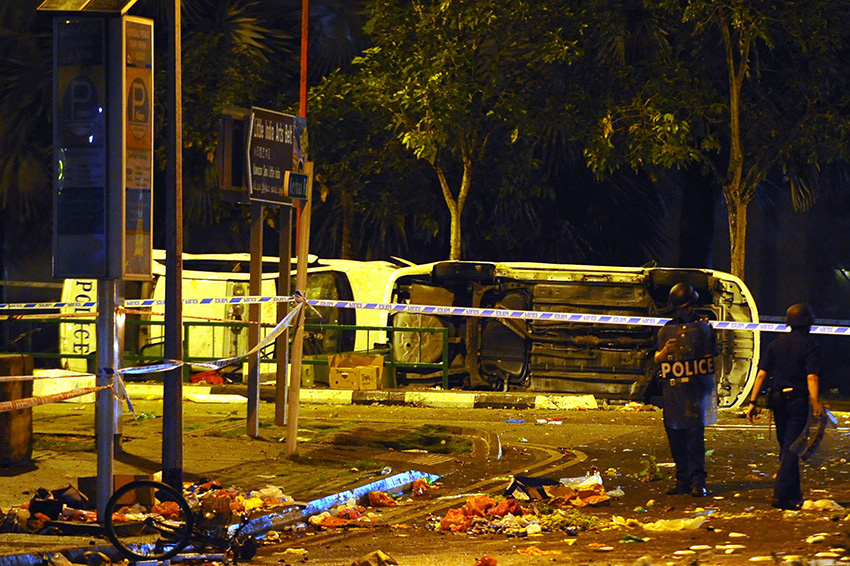 新加坡中心城区印度族群聚集地小印度跑马埔路和翰莎路交叉路口8日晚9时23分发生骚乱,多辆警车和救护车被掀翻并被点燃,目前人员伤亡情况不详。12月8日,警察在新加坡街头翻覆的警车旁拉起警戒线。