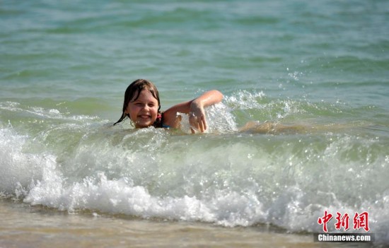 12月13日,一位外国小游客在海中玩耍。目前,中国北方各地早已进入寒冷的冬季,雾霾天气笼罩各地,而海南三亚以清新的空气和迷人的热带海洋风光正吸引了众多中外游客前来度假。众多游客在三亚大东海旅游区海边戏水、晒日光浴,享受天涯海角不一样的冬日暖阳。中新社发 骆云飞 摄