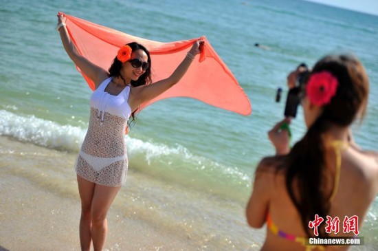 12月13日,两位美女游客在海边拍照留影。目前,中国北方各地早已进入寒冷的冬季,雾霾天气笼罩各地,而海南三亚以清新的空气和迷人的热带海洋风光正吸引了众多中外游客前来度假。众多游客在三亚大东海旅游区海边戏水、晒日光浴,享受天涯海角不一样的冬日暖阳。中新社发 骆云飞 摄