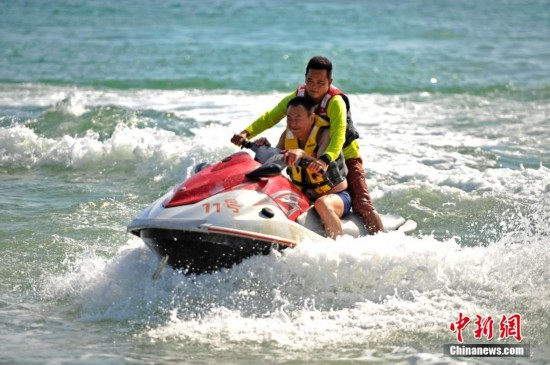 12月13日,游客骑水上摩托艇破浪飞驰。目前,中国北方各地早已进入寒冷的冬季,雾霾天气笼罩各地,而海南三亚以清新的空气和迷人的热带海洋风光正吸引了众多中外游客前来度假。众多游客在三亚大东海旅游区海边戏水、晒日光浴,享受天涯海角不一样的冬日暖阳。中新社发 骆云飞 摄