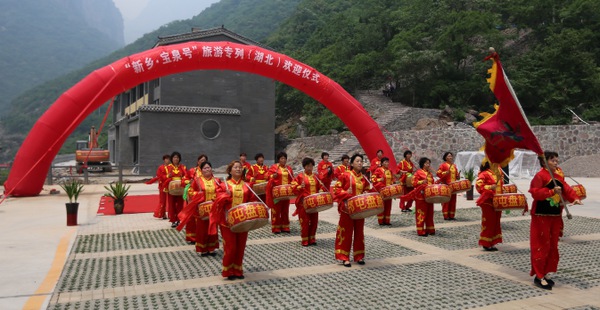 5月17日13时,20余辆大巴车开进河南宝泉景区,桃花坪停车场顿时锣鼓喧天,迎接乘坐“新乡·宝泉号”旅游专列而来的千余名湖北游客。在宝泉景区,游客们将感受碧水丹山的魅力以及中原最大瀑布群的震撼。
