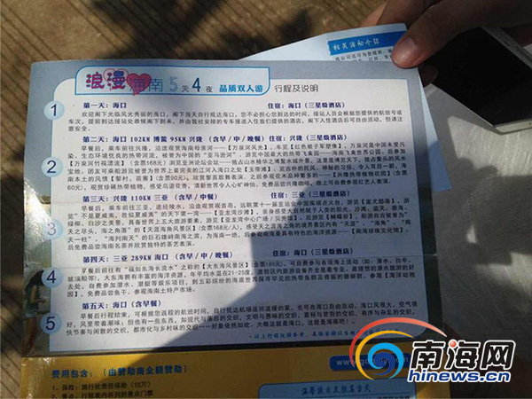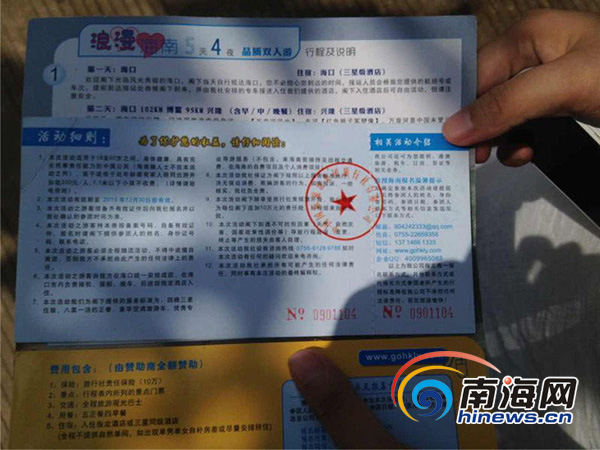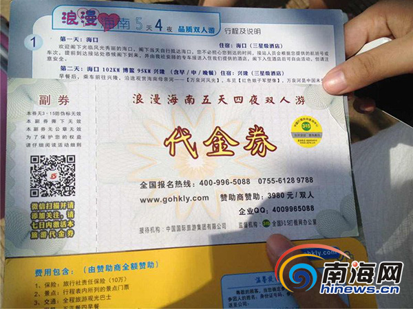 近日,广东湛江的张先生(化名)收到了某商场送给他的一张价值3980元的浪漫海南五天四夜双人游的代金券,于是他带着女朋友报名交了团费来海南旅游,随后却发现自己上了当。