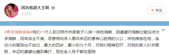 10月7日,网友“@因为我是大王啊”在微博爆料自己一家人在山东日照某店吃海鲜,因为点海鲜少找来店主不满,被扒衣围殴,同行的婆婆、公公、幼小孩子均被殃及。当地公安已关注此事。