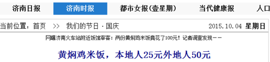 10月2日,网友“@Simon蒙meng”发微博,称在济南火车站附近遇到一家黑店。他在事先没有问价的情况下,点了两份黄焖鸡米饭,被店家索要100元餐费,平均一份50元。老板称这价格是济南物价局规定的。济南媒体暗访后称,可能因为是本地人的缘故,记者被给出了一份黄焖鸡25元的价格。