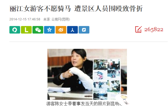 除了酒托,还有游客投诉称在拉市海骑马被威胁,花去2880元,还没有骑到马。丽江拉市海骑马,也是频被曝光的旅游项目。2014年就有新疆游客因不愿骑马不交人头费,遭景区人员围殴致骨折。