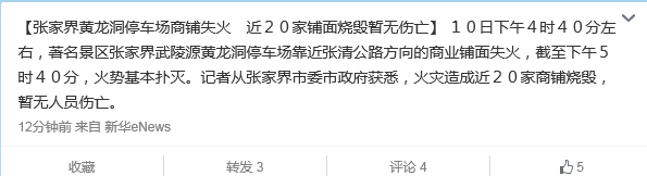 【张家界黄龙洞停车场商铺失火 近20家铺面烧毁暂无伤亡】 10日下午4时40分左右,著名景区张家界武陵源黄龙洞停车场靠近张清公路方向的商业铺面失火,截至下午5时40分,火势基本扑灭。记者从张家界市委市政府获悉,火灾造成近20家商铺烧毁,暂无人员伤亡。