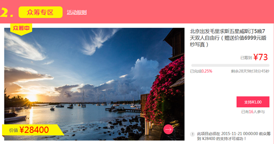 与秒杀活动的激烈刺激不同,凯撒度假此次特别推出的双人自由行1元众筹活动,则是集趣味与幸运于一体,带给顾客另一种惊喜与体验。活动期间,凯撒度假将为价值16000元的毛里求斯威斯汀5晚7天自由行发起众筹 (含赠送价值6999元的写真)。参与用户凡支持1元并支付成功,即可得到参与资格,获得随机生成的一个6位数抽奖号。凯撒度假官方将在支持者中抽取幸运者,其他参与用户也可获得凯撒旅行提供的50元优惠券。毫无疑问,这种稳赚不赔的活动,在第一时间受到了顾客的高度关注,目前活动正在如火如荼进行中,渴望收获一份幸运的人士可迅速前往。