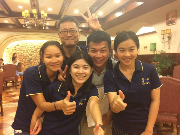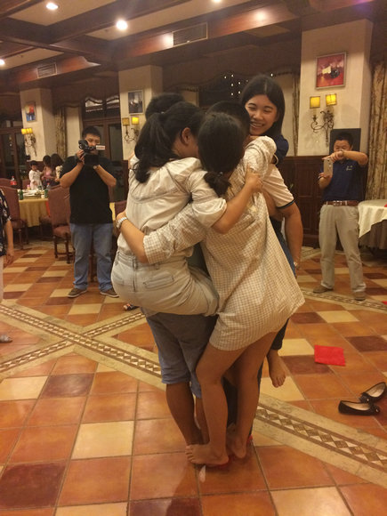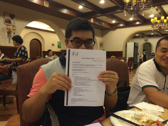 获奖小组摆出小飞人造型领取一呆房券大奖