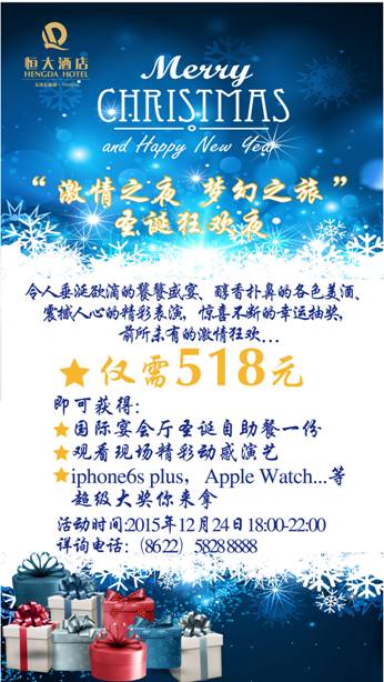 天津东丽湖恒大酒店盛情邀请您和家人朋友一道来享受这个精彩绝伦的夜晚。美味回旋,感动不断,垂询热线:022-58288888