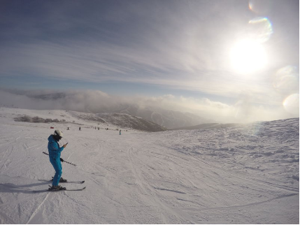 说完了吊箱,边上的这条雪道也是很亲民的。以前去北大壶,亚布力,万龙,里面高级道坡度吓人的很。然而云顶这条中级道就非常合适一般水平的雪友了,既不会太陡危险,也不会很平缓让大家觉得没有乐趣。所以今天上午我们基本都是在这条中级道上面恢复动作,人虽然很多但是因为雪道宽大也没有显得很拥挤,中午累了,就在山顶的餐厅金花阁看着好风景吃了顿美美的热腾腾的午餐。