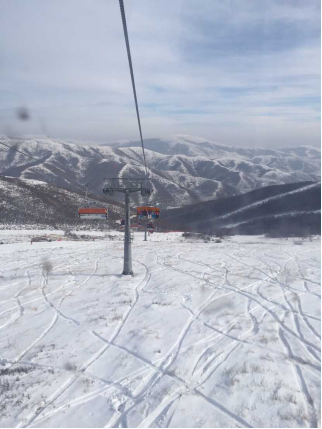 咱们先说吊箱中初级道,这个是本人的最爱,高速封闭吊箱对于滑雪者来说简直是恩赐啊。当你高速滑到山脚下的时候,绝对不希望看见慢速缆车导致大家排队,更不希望坐在缆车上一坐坐十几分钟被冷风吹着,结果好不容易浑身热身了,上去又凉了。所以,吊箱对我们来说绝对是最棒的选择,坐在里面,人少的时候伸伸腿,把头盔摘下来擦擦汗,拿出手机照相发微信都没问题,里面又舒适又暖和。