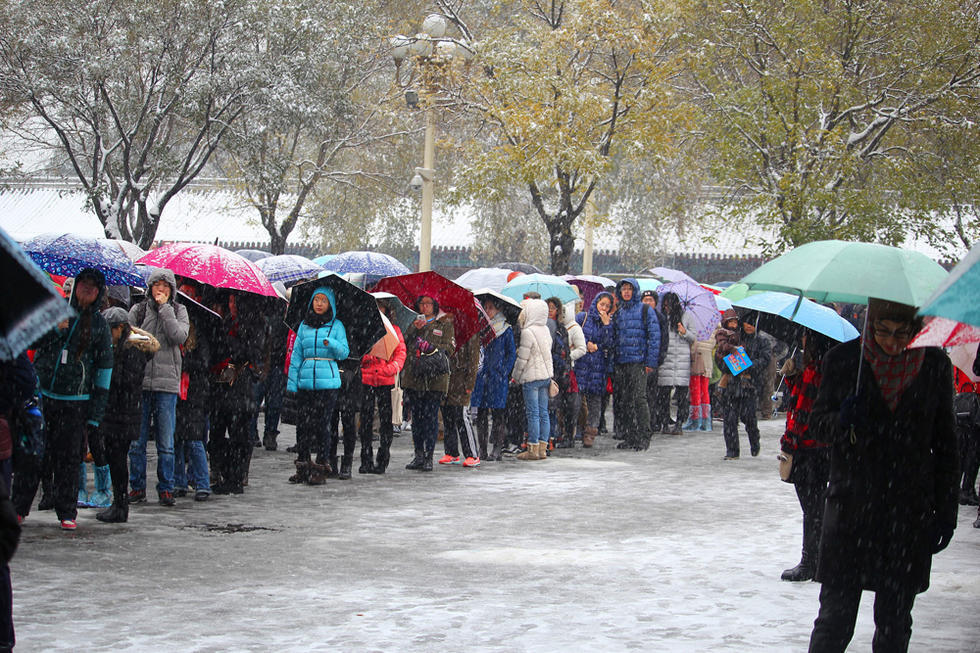 北京迎来强降雪,故宫游人撑伞排队购票赏雪景。