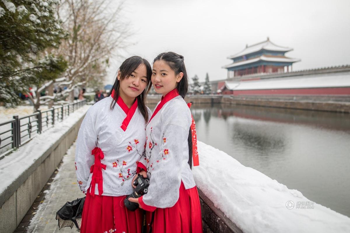 11月22日,北京故宫外,两个穿汉服拍照的美女。