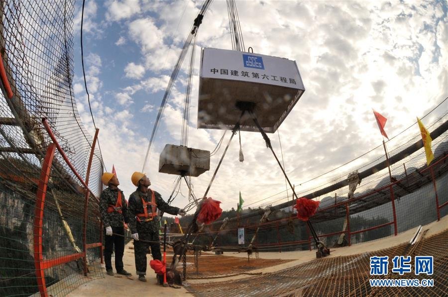 张家界大峡谷玻璃桥合龙施工现场(12月3日摄)。