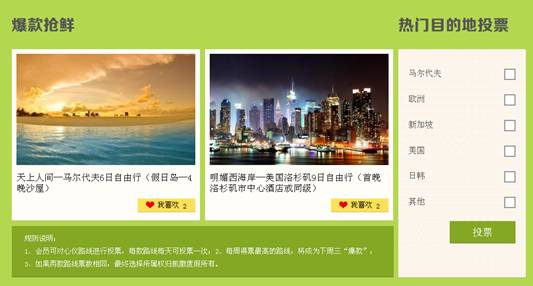 与此同时,在热门目的地投票区可以看到,马尔代夫6日自由行得票遥遥领先,不出意外,该产品将进入下周三(12月9日)“爆款秒杀”列表,并以超低惊喜价接受会员们的抢购惠享。