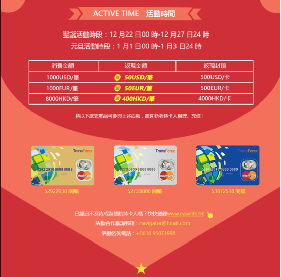 在圣诞季中,领航顺应时尚潮流趋势,消费者前往香港扫货消费还能享受超值补贴。在圣诞及元旦期间,只要持领航电子旅支进行消费,无论你是去港澳扫货还是欧美日韩血拼,在商场或电商消费,将有机会获得最高4000港币的高额返现!消费返现最高达5%!福利惠及消费者,在圣诞季可任性扫货,安全快速完成付款流程,全球刷无限制,在这个冬季,领航一卡伴你满载而归!