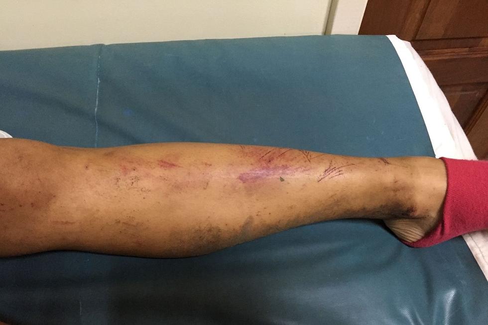 最后2人在努力不懈下终于成功逃脱,在逃脱的路程中历经千辛,因为沿途有大量毒藤及野狗,所幸2人被附近的村民发现后,在协助下送院治疗,最终脱险。图为克里曼斯腿上的伤。