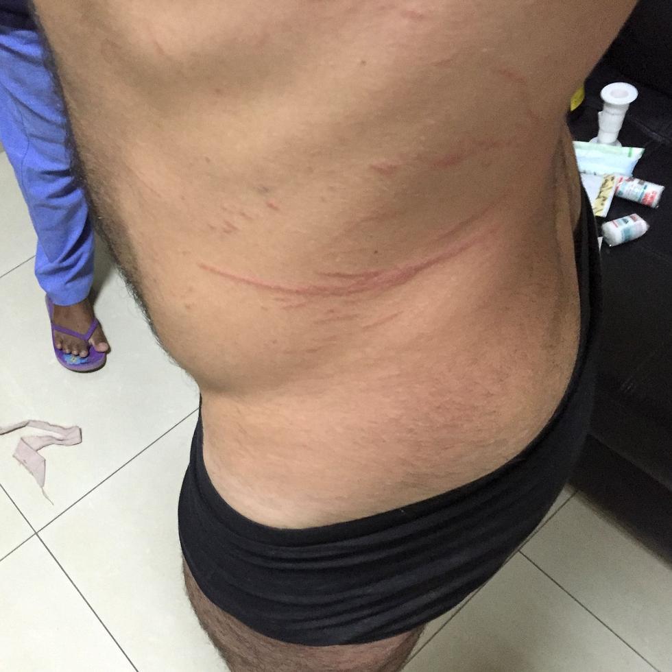 据报道,当地随后确认有一对情侣,在著名旅游景点科科达小径受袭,而且身上财物尽失,但未透露2人身份。警方指男子当时被绑在树上,女子则被族人轮奸。图为纳瓦内身上的伤。