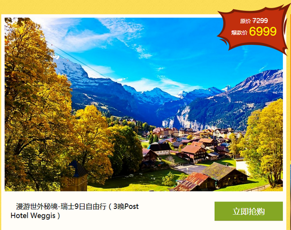据悉,此次爆款产品“瑞士9日自由行”的出发日期均设在3月份的周一、周四、周六,这意味着在家欢度一个完美的中国年之后,即可收拾行囊,准备前往欧洲胜地,用另一种不同的方式开启和迎接自己崭新的2016!