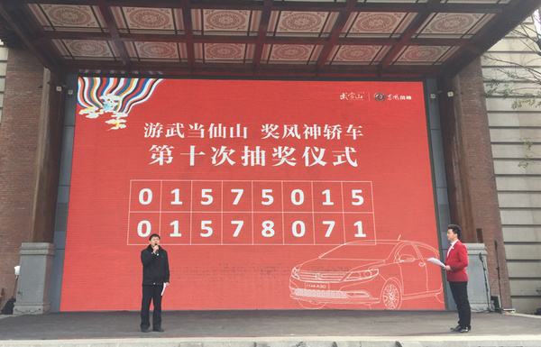 第十期抽(颁)奖仪式在江城人民的见证下取得圆满成功。武当山旅游局向上月的幸运游客、来自河南省邓州市的李兆僧送出风神轿车一台,并授予其“武当山旅游宣传大使”的称号。作为本次活动武当山旅游宣传大使和大奖得主,李兆僧承诺一定会不负使命,传播武当文化,有机会会再次回到武当山还愿。此外,在十堰市公证处工作人员公证下,还抽出本月的两名幸运游客,其门票兑奖券号码分别为01575015、01578071。